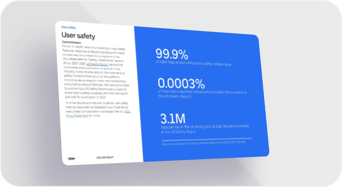 User safety User safety Commitment For an in-depth view of our existing in-app safety features, response protocols, background-check 99.9% procedures, and prevention programs in the of Uber trips ended without any safety-related issue US, please see the “Safety investments” section of our 2017-2018 US Safety Report. As the first comprehensive publication of its kind in the industry, it also shares data on the most serious safety incidents that occur on the platform, including sexual assault, motor vehicle fatalities, and physical assault fatalities. We have committed 0.0003% to publishing a US Safety Report every 2 years to of trips had a reported critical safety incident (the incidents in share Uber’s safety progress, with the next report the US Safety Report) planned for publication in 2021. To drive results and reduce incidents, user safety metrics have been embedded in our most senior executives’ compensation packages. See our 2021 Proxy Statement for more. 3.1M trips per day in the US during 2017 & 2018, the period covered in the US Safety Report Figures are sourced from Uber’s US Safety Report and reflect 2017-2018 data. 2021 ESG Report 4141