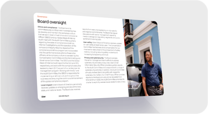 Governance Board oversight Ethics and compliance: The Board and its reports from executive leadership on city-specific committees play a critical role in overseeing how and regional commitments. The Board has regular we develop and maintain the workplace culture discussions with senior management regarding that we want. Uber’s Chief Ethics and Compliance media coverage and regulatory, legislative, and public Officer (CECO) and our Global Head of Internal sentiment involving Uber. Audit meet with the Audit Committee quarterly User safety: Uber’s Board of Directors receives updates regarding the state of compliance and ethics, on user safety at least twice a year. The Compensation internal investigations, and the operation of the Committee has tied executive compensation for our company’s Integrity Helpline. Aspects of the most senior executives to the achievement of safety compliance and ethics program are incorporated metrics, including reducing safety incidents and into the performance evaluations of executive increasing transparency and trust. officers, while company culture is overseen by the Compensation Committee and the Nominating and Privacy and cybersecurity: The Board oversees Governance Committee. The CECO and the Global the senior management team’s efforts to address Head of Internal Audit report to the CLO and CFO, cybersecurity and data privacy risks. Uber’s Chief respectively, and work with the company’s executive Information Security Officer provides quarterly reports leadership team (ELT) as part of our enterprise risk to the Audit Committee and is responsible for a range of management program. Working with the ELT and cybersecurity activities. In addition, the Audit Committee the Audit Committee, the CECO is responsible for annually reviews Uber’s risk profile with respect to implementing an ethical culture throughout the cybersecurity matters. Our Chief Privacy Officer provides business and ensuring the continuous enhancement reports to the Board annually and as requested from of the global compliance program. time to time. In 2020, the Audit Committee amended its Local impact: Uber’s Board of Directors periodically charter to explicitly oversee issues related to data privacy. receives updates on emerging policies at the local, state, and national levels. The Board also receives 2021 ESG Report 1717