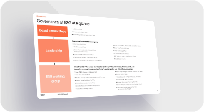 Governance Governance of ESG at a glance Audit Committee Board committees Compensation Committee Nominating and Governance Committee Executive leaders at the company Chief Executive Officer Senior Vice President, Mobility and Business Operations Chief Financial Officer Senior Vice President, Delivery Leadership Senior Vice President, Chief Legal Officer Chief Technology Officer and Corporate Secretary Vice President, Core Services Chief Diversity and Inclusion Officer Senior Vice President, Chief Product Officer Senior Vice President, Chief People Officer Head of Uber Freight Senior Vice President, Marketing and Public Affairs More than 50 FTEs across the Mobility, Delivery, Policy, Workplace, Finance, and Legal teams focus on various aspects of Uber’s sustainability and ESG efforts, including: Head of ESG Strategy and Engagement Public Policy Manager, Consumer Protection and Safety ESG working Head of Investor Relations Director, Social Impact Head of Diversity and Inclusion Strategy and Planning Global Sustainability Program Manager, Workplace group Head of Global Sustainability Policy Senior Counsel, Legal Compliance Head of Work and Economic Policy Manager, Strategy and Planning, Uber Eats Director, Policy for Cities and Transportation Senior Manager, Strategy and Planning, Uber Transit Public Policy Manager, Safety Senior Associate, Strategy and Business Development, Uber Freight 2021 ESG Report 18