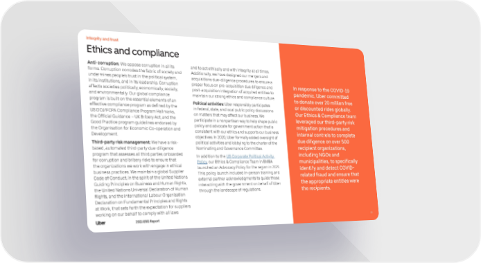 Integrity and trust Ethics and compliance Anti-corruption: We oppose corruption in all its and to act ethically and with integrity at all times. forms. Corruption corrodes the fabric of society and Additionally, we have designed our mergers and undermines people’s trust in the political system, acquisitions due-diligence procedures to ensure a in its institutions, and in its leadership. Corruption proper focus on pre-acquisition due diligence and In response to the COVID-19 affects societies politically, economically, socially, post-acquisition integration of acquired entities to pandemic, Uber committed and environmentally. Our global compliance maintain our strong ethics and compliance culture. to donate over 20 million free program is built on the essential elements of an Political activities: Uber responsibly participates or discounted rides globally. effective compliance program as defined by the in federal, state, and local public policy discussions US DOJ/FCPA Compliance Program Hallmarks, on matters that may affect our business. We Our Ethics & Compliance team the Official Guidance – UK Bribery Act, and the participate in a nonpartisan way to help shape public leveraged our third-party risk Good Practice program guidelines endorsed by policy and advocate for government action that is mitigation procedures and the Organisation for Economic Co-operation and consistent with our ethics and supports our business internal controls to complete Development. objectives. In 2020, Uber formally added oversight of Third-party risk management: We have a risk- political activities and lobbying to the charter of the due diligence on over 500 based, automated third-party due-diligence Nominating and Governance Committee. recipient organizations, program that assesses all third parties onboarded In addition to the US Corporate Political Activity including NGOs and for corruption and bribery risks to ensure that Policy, our Ethics & Compliance Team in EMEA municipalities, to specifically the organizations we work with engage in ethical launched an Advocacy Policy for the region in 2021. identify and detect COVID- business practices. We maintain a global Supplier This policy launch included in-person training and Code of Conduct, in the spirit of the United Nations external partner acknowledgments to guide those related fraud and ensure that Guiding Principles on Business and Human Rights, interacting with the government on behalf of Uber the appropriate entities were the United Nations Universal Declaration of Human through the landscape of regulations. the recipients. Rights, and the International Labour Organization Declaration on Fundamental Principles and Rights at Work, that sets forth the expectation for suppliers working on our behalf to comply with all laws 2021 ESG Report 5959