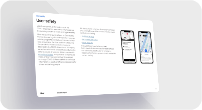 User safety User safety Like all companies, at the beginning of the We also launched a number of campaigns aimed at COVID-19 pandemic, we acted quickly to address popularizing the use of face covers and other health the evolving concern of health and hygiene safety. safety tips, including: Uber was quick to launch a Door-to-Door Safety • No Mask, No Ride Standard consisting of COVID-specific measures, • We Protect Each Other policies, programs, and features intended to help keep everyone on the Uber platform safe during • Wash, Wear, Air the pandemic. In addition to the measures In July 2020, we launched an updated described in the COVID-19 section of this report, Public Health Portal where public health officials we worked with health and safety experts, like the can submit requests to Uber for emergency CDC, to provide drivers and delivery people with responses to infection spread and data needed for educational videos and guidance on how to use contact tracing. masks and sanitizers correctly and developed an in-app COVID-19 Resource Hub to centralize information on safety and financial assistance for drivers and delivery people. 2021 ESG Report 39