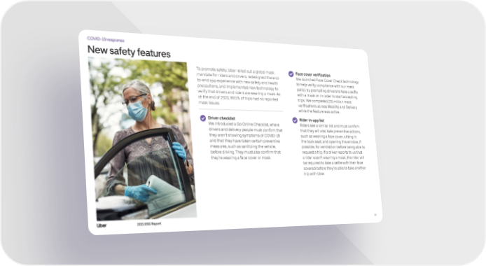 COVID-19 response New safety features To promote safety, Uber rolled out a global mask Face cover verification mandate for riders and drivers, redesigned the end- We launched Face Cover Check technology to-end app experience with new safety and health to help verify compliance with our mask precautions, and implemented new technology to policy by prompting drivers to take a selfie verify that drivers and riders are wearing a mask. As with a mask on in order to start accepting of the end of 2020, 99.5% of trips had no reported trips. We completed 231 million mask mask issues. verifications across Mobility and Delivery while the feature was active. Driver checklist Rider in-app list We introduced a Go Online Checklist, where Riders see a similar list and must confirm drivers and delivery people must confirm that that they will also take preventive actions, they aren’t showing symptoms of COVID-19 such as wearing a face cover, sitting in and that they have taken certain preventive the back seat, and opening the window, if measures, such as sanitizing the vehicle, possible, for ventilation before being able to before driving. They must also confirm that request a trip. If a driver reports to us that they’re wearing a face cover or mask. a rider wasn’t wearing a mask, the rider will be required to take a selfie with their face covered before they’re able to take another trip with Uber. 2021 ESG Report 24