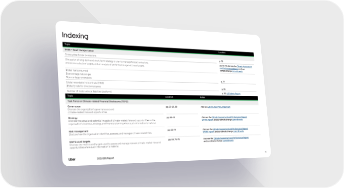 Indexing Topic Location SASB - Road Transportation Gross global Scope 1 emissions p. 76 Discussion of long-term and short-term strategy or plan to manage Scope 1 emissions, pp. 63-74; also see the Climate Assessment emissions reduction targets, and an analysis of performance against those targets. and Performance Report; and our climate change commitments 1 total fuel consumed 2 percentage natural gas 3 percentage renewables p. 77 1 total recordable incident rate (TRIR) 2 fatality rate for direct employees p. 85 Number of motor vehicle fatalities (platform) p. 86; US Safety Report Topic Location Notes Task Force on Climate-related Financial Disclosures (TCFD) Governance pp. 15-16, 69 Also see Uber's 2021 Proxy Statement Disclose the organization’s governance around climate-related risks and opportunities. Strategy pp. 63-74 Also see the Climate Assessment and Performance Report, Disclose the actual and potential impacts of climate-related risks and opportunities on the SPARK! report; and our climate change commitments organization’s business, strategy, and financial planning where such information is material. Risk management pp. 63-74 Also see the Climate Assessment and Performance Report, Disclose how the organization identifies, assesses, and manages climate-related risks. SPARK! report; and our climate change commitments Metrics and targets pp. 64, 76-78 Also see the Climate Assessment and Performance Report Disclose the metrics and targets used to assess and manage relevant climate-related risks and and our climate change commitments opportunities where such information is material. 2021 ESG Report 95