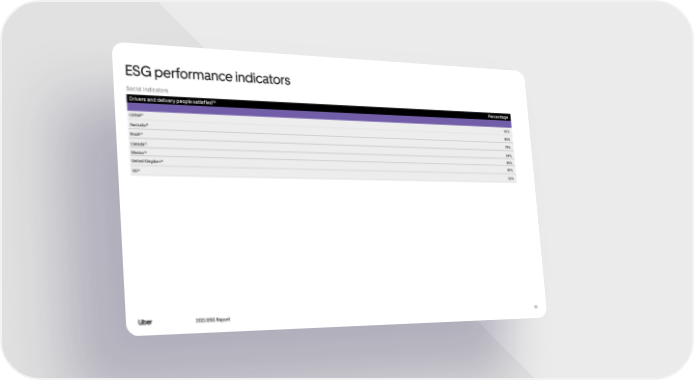 Uber ESG Report Page 87 Page 89ESG performance indicators Social indicators Drivers and delivery people satisfied³⁹ Percentage Global⁴⁰ 81% Australia⁴¹ 83% Brazil⁴¹ 79% Canada⁴¹ 84% Mexico⁴¹ 85% United Kingdom⁴¹ 82% US⁴¹ 82% 2021 ESG Report 88