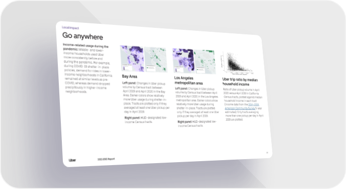 Local impact Go anywhere Income-related usage during the pandemic: Middle- and lower- income households used Uber more consistently before and during the pandemic. For example, during COVID-19 shelter-in-place policies, demand for rides in lower- income neighborhoods in California Bay Area Los Angeles Uber trip ratio by median remained at similar levels as pre- Left panel: Changes in Uber pickup metropolitan area household income COVID, whereas demand dropped volume by Census tract between precipitously in higher-income Left panel: Changes in Uber pickup Ratio of Uber pickup volume in April neighborhoods. April 2019 and April 2020 in the Bay volume by Census tract between April 2020 versus April 2019 in California Area. Darker colors show relatively 2019 and April 2020 in the Los Angeles Census tracts, plotted against median more Uber usage during shelter-in- metropolitan area. Darker colors show household income in each tract place. Tracts are plotted only if they relatively more Uber usage during (income data from the 2014–2018 averaged at least one Uber pickup per shelter-in-place. Tracts are plotted American Community Survey 5-year day in April 2019. only if they averaged at least one Uber estimates). Only tracts averaging Right panel: HUD-designated low- pickup per day in April 2019. more than one pickup per day in April income Census tracts. Right panel: HUD-designated low- 2019 are plotted. income Census tracts. 2021 ESG Report 54