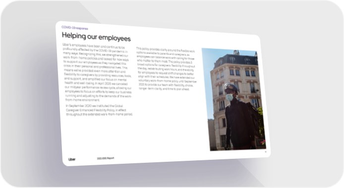 COVID-19 response Helping our employees Uber’s employees have been and continue to be This policy provides clarity around the flexible work profoundly affected by the COVID-19 pandemic in options available to parents and caregivers, so many ways. Recognizing this, we strengthened our employees can balance work with caring for those work-from-home policies and looked for new ways who matter to them most. The policy provides 3 to support our employees as they navigated this broad options for caregivers: flexibility throughout crisis in their personal and professional lives. This the day, redistributing work hours, and the ability means we’ve provided even more attention and for employees to request shift changes to better flexibility to caregivers by providing resources, tools, align with their schedules. We have extended our and support, and amplified our focus on mental voluntary work-from-home policy until September health and well-being. In April 2020 we canceled 2021 to provide our team with flexibility, choice, our midyear performance review cycle, allowing our longer-term clarity, and time to plan ahead. employees to focus on efforts to keep our business running and adjusting to the demands of the work- from-home environment. In September 2020 we instituted the Global Caregiver Enhanced Flexibility Policy, in effect throughout the extended work-from-home period. 2021 ESG Report 26