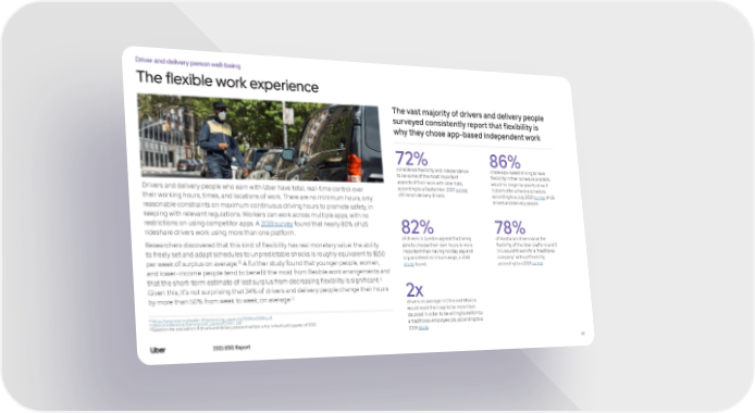 Driver and delivery person well-being The flexible work experience The vast majority of drivers and delivery people surveyed consistently report that flexibility is why they chose app-based independent work 72% 86% considered flexibility and independence chose app-based driving to have to be some of the most important flexibility in their schedule and 86% aspects of their work with Uber Eats, would no longer be able to drive if Drivers and delivery people who earn with Uber have total, real-time control over according to a September 2020 survey it didn’t offer a flexible schedule, their working hours, times, and locations of work. There are no minimum hours, only of French delivery drivers. according to a July 2020 survey of US drivers and delivery people. reasonable constraints on maximum continuous driving hours to promote safety, in keeping with relevant regulations. Workers can work across multiple apps, with no restrictions on using competitor apps. A 2019 survey found that nearly 80% of US 82% 78% rideshare drivers work using more than one platform. of drivers in London agreed that being of Australian drivers value the Researchers discovered that this kind of flexibility has real monetary value: the ability able to choose their own hours is more flexibility of the Uber platform and 3 to freely set and adapt schedules to unpredictable shocks is roughly equivalent to $150 important than having holiday pay and in 5 wouldn’t work for a “traditional 10 a guaranteed minimum wage, a 2018 company” without flexibility, per week of surplus on average. A further study found that younger people, women, study found. according to a 2019 survey. and lower-income people tend to benefit the most from flexible work arrangements and 11 that the short-term estimate of lost surplus from decreasing flexibility is significant. Given this, it’s not surprising that 34% of drivers and delivery people change their hours 2x 12 by more than 50% from week to week, on average. drivers on average in Chile and Mexico would need their pay to be more than 10https://www.nber.org/system/files/working_papers/w23296/w23296.pdf doubled in order to be willing to switch to 11 https://conference.nber.org/conf_papers/f133011.pdf 12 a traditional employee job, according to a Based on the population of drivers and delivery people that took a trip in the fourth quarter of 2020. 2019 study. 2021 ESG Report 30