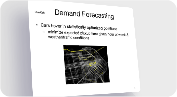 Uber Valuation at IPO $75B Page 15 Page 17Demand Forecasting • Cars hover in statistically optimized positions – minimize expected pickup time given hour of week & weather/traffic conditions 16