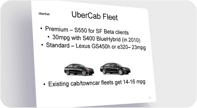 Uber Valuation at IPO $75B Page 12 Page 14UberCab Fleet • Premium – S550 for SF Beta clients • 30mpg with S400 BlueHybrid (in 2010) • Standard – Lexus GS450h or e320– 23mpg • Existing cab/towncar fleets get 14-16 mpg 13