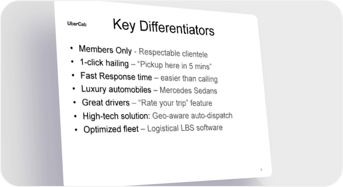 Key Differentiators • Members Only - Respectable clientele • 1-click hailing – “Pickup here in 5 mins” • Fast Response time – easier than calling • Luxury automobiles – Mercedes Sedans • Great drivers – “Rate your trip” feature • High-tech solution: Geo-aware auto-dispatch • Optimized fleet – Logistical LBS software 6