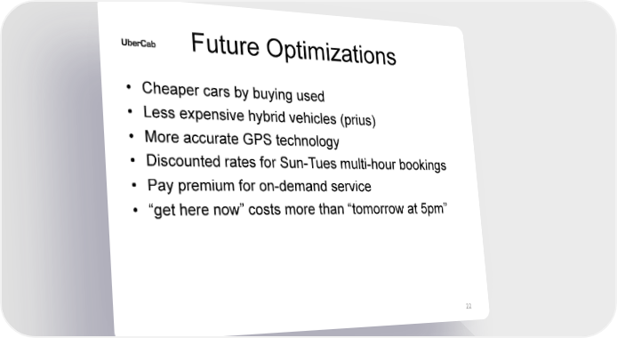 Future Optimizations • Cheaper cars by buying used • Less expensive hybrid vehicles (prius) • More accurate GPS technology • Discounted rates for Sun-Tues multi-hour bookings • Pay premium for on-demand service • “get here now” costs more than “tomorrow at 5pm” 22