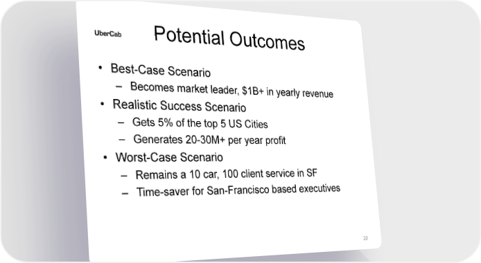 Potential Outcomes • Best-Case Scenario – Becomes market leader, $1B+ in yearly revenue • Realistic Success Scenario – Gets 5% of the top 5 US Cities – Generates 20-30M+ per year profit • Worst-Case Scenario – Remains a 10 car, 100 client service in SF – Time-saver for San-Francisco based executives 20