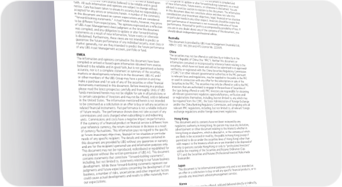 For marketing and information purposes by UBS. For professional / of this document to acquire interests in securities under the laws of your qualified / institutional clients and investors. jurisdiction. Using, copying, redistributing or republishing any part of this This document does not replace portfolio and fund-specific materials. document without prior written permission from UBS Asset Management Commentary is at a macro or strategy level and is not with reference to is prohibited. Any statements made regarding investment performance any registered or other mutual funds. objectives, risk and/or return targets shall not constitute a representation or warranty that such objectives or expectations will be achieved or Americas risks are fully disclosed. The information and opinions contained in this The views expressed are a general guide to the views of UBS Asset document is based upon information obtained from sources believed Management as of November 2022. The information contained herein to be reliable and in good faith but no responsibility is accepted for should not be considered a recommendation to purchase or sell securities any misrepresentation, errors or omissions. All such information and or any particular strategy or fund. Commentary is at a macro level and is opinions are subject to change without notice. A number of comments not with reference to any investment strategy, product or fund offered in this document are based on current expectations and are considered by UBS Asset Management. The information contained herein does not “forward-looking statements”. Actual future results may prove to be constitute investment research, has not been prepared in line with the different from expectations and any unforeseen risk or event may arise requirements of any jurisdiction designed to promote the independence of in the future. The opinions expressed are a reflection of UBS Asset investment research and is not subject to any prohibition on dealing ahead Management’s judgment at the time this document is compiled and of the dissemination of investment research. The information and opinions any obligation to update or alter forward-looking statements as a result contained in this document have been compiled or arrived at based upon of new information, future events, or otherwise is disclaimed. You are information obtained from sources believed to be reliable and in good advised to exercise caution in relation to this document. The information faith. All such information and opinions are subject to change without in this document does not constitute advice and does not take into notice. Care has been taken to ensure its accuracy but no responsibility is consideration your investment objectives, legal, financial or tax situation accepted for any errors or omissions herein. A number of the comments or particular needs in any other respect. Investors should be aware that in this document are based on current expectations and are considered past performance of investment is not necessarily indicative of future “forward-looking statements.” Actual future results, however, may prove performance. Potential for profit is accompanied by possibility of loss. If to be different from expectations. The opinions expressed are a reflection you are in any doubt about any of the contents of this document, you of UBS Asset Management’s best judgment at the time this document should obtain independent professional advice. was compiled, and any obligation to update or alter forward-looking statements as a result of new information, future events or otherwise Australia is disclaimed. Furthermore, these views are not intended to predict or This document is provided by UBS Asset Management (Australia) Ltd, guarantee the future performance of any individual security, asset class or ABN 31 003 146 290 and AFS License No. 222605. market generally, nor are they intended to predict the future performance of any UBS Asset Management account, portfolio or fund. China The securities may not be offered or sold directly or indirectly in the EMEA People’s Republic of China (the “PRC”). Neither this document or The information and opinions contained in this document have been information contained or incorporated by reference herein relating to the compiled or arrived at based upon information obtained from sources securities, which have not been and will not be submitted to or approved/ believed to be reliable and in good faith, but is not guaranteed as being verified by or registered with the China Securities Regulatory Commission accurate, nor is it a complete statement or summary of the securities, (“CSRC”) or other relevant governmental authorities in the PRC pursuant markets or developments referred to in the document. UBS AG and / to relevant laws and regulations, may be supplied to the public in the PRC or other members of the UBS Group may have a position in and may or used in connection with any offer for the subscription or sale of the make a purchase and / or sale of any of the securities or other financial Securities in the PRC. The securities may only be offered or sold to the PRC instruments mentioned in this document. Before investing in a product investors that are authorized to engage in the purchase of Securities of please read the latest prospectus carefully and thoroughly. Units of UBS the type being offered or sold. PRC investors are responsible for obtaining funds mentioned herein may not be eligible for sale in all jurisdictions or all relevant government regulatory approvals/licenses, verification and/ to certain categories of investors and may not be offered, sold or delivered or registrations themselves, including, but not limited to, any which may in the United States. The information mentioned herein is not intended be required from the CSRC, the State Administration of Foreign Exchange to be construed as a solicitation or an offer to buy or sell any securities or