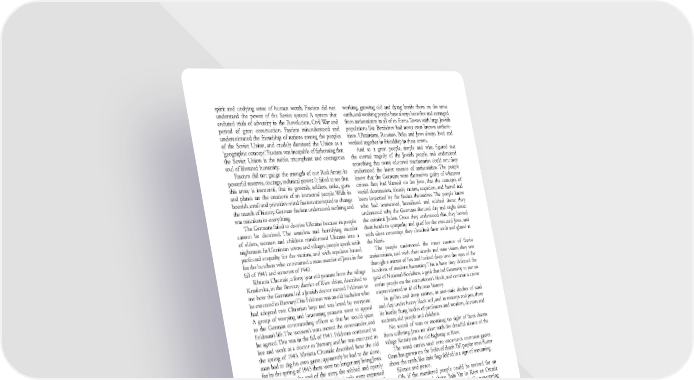 spirit and undying sense of human worth. Fascism did not working, growing old and dying beside them on the same understand the power of the Soviet system! A system that earth, and working people have always been free and estranged endured trials of adversity in the Revolution, Civil War and from antisemitism in all of its forms. Towns with large Jewish period of great construction. Fascism misunderstood and populations like Berdichev had never even known antisem- underestimated the friendship of nations among the peoples itism. Ukrainians, Russians, Poles and Jews always lived and of the Soviet Union, and crudely dismissed the Union as a worked together in friendship in these towns. ‘geographic concept.’ Fascism was incapable of fathoming that And so a great people, simple and wise, figured out the Soviet Union is the noble, triumphant and courageous the eternal tragedy of the Jewish people, and understood soul of liberated humanity. something that many educated reactionaries could not: they Fascism did not gauge the strength of our Red Army; its understood the inner essence of antisemitism. The people powerful reserves, courage, technical power. It failed to see that knew that the Germans were themselves guilty of whatever this army is immortal, that its generals, soldiers, tanks, guns crimes they had blamed on the Jews, that the concepts of and planes are the creations of an immortal people. With its world domination, bloody racism, suspicion, and hatred had boorish, small and primitive mind fascism attempted to change been imported by the fascists themselves. The people knew the march of history. German fascism understood nothing and who had tormented, humiliated and robbed them; they was mistaken in everything. understood why the Germans shouted day and night about The Germans failed to deceive Ukraine because its people the criminal Juden. Once they understood this, they bowed cannot be deceived. The senseless and horrifying murder their heads in sympathy and grief for the executed Jews, and of elders, women and children transformed Ukraine into a with silent contempt, they clenched their teeth and glared at nightmare. In Ukrainian towns and villages, people speak with the Nazis. profound empathy for the victims, and with repulsive hatred The people understood the inner essence of fascist for the butchers who committed a mass murder of Jews in the antisemitism, and with their simple and wise vision, they saw fall of 1941 and summer of 1942. through a mirror of lies and looked deep into the eyes of the Khristia Chuniak, a forty year old peasant from the village butchers of modern humanity. This is how they defeated the Krasilovka, in the Brovary district of Kiev oblast, described to goal of National-Socialism, a goal that led Germany to put an me how the Germans led a Jewish doctor named Feldman to entire people on the executioner’s block, and commit a crime be executed in Brovary. This Feldman was an old bachelor who unprecedented in all of human history. had adopted two Christian boys and was loved by everyone. In gullies and deep ravines, in anti-tank ditches of sand A group of weeping and lamenting peasants went to appeal and clay, under heavy black soil, and in swamps and pits, there to the German commanding officer so that he would spare lie hastily flung bodies of professors and workers, doctors and Feldman’s life. The women’s tears moved the commander, and students, old people and children. he agreed. This was in the fall of 1941. Feldman continued to No sound of tears or moaning; no sight of faces drawn live and work as a doctor in Brovary, and he was executed in from suffering. Jews are silent with the dreadful silence of the the spring of 1943. Khristia Chuniak described how the old village Kozary on the old highway to Kiev. man had to dig his own grave; apparently he had to die alone, The wind carries sand onto enormous common graves. for by the spring of 1943 there were no longer any living Jews. Grass has grown on the fields of death. Tall poplar trees flutter As she came to the end of the story, she sobbed and openly above the earth, like dark flags folded in a sign of mourning. wept. The sorrow-filled words of this simple story expressed Silence and peace. with astonishing clarity Ukraine’s relationship to its murdered Oh, if the murdered people could be revived for an J e wr y. instant, if the ground above Babi Yar in Kiev or Ostraia No one believed the fascist propaganda that Jews were Mogila in Voroshilovgrad could be lifted, if a penetrating preparing to enslave Ukraine and take over the world. cry came forth from hundreds and thousands of lips Ukrainians were familiar with Jews after generations of covered in soil, then the Universe would shudder. The iddish version ‘Ukraina on yidn’ aeared in Einikayt on ove€er ‚ƒ„… and †ece€er ‚ƒ„…‡ for the Russian €ackˆtranslation fro the iddish‰ see ‘Ukraina €ez evreev‰’ transŠ Rokhl Bauvol’‰ in Vasilii ‹rossan‰ a evreiski tei‰ edŠ Shion Œarkish ŽJerusale‘ Bi€lioteka ’liya‰ ‚ƒ“” volŠ‘………ˆ…„•Š The colete Russian version of ‘Ukraina €ez evreev’ on –hich the resent translation is €ased ay €e found in VEK‘ Vestnik Evreiskoi Kultury‰ noŠ „ ŽRi—a‰ ‚ƒƒ•”‘ ‚ˆ“ Notes‘ †esna and †nieer‘ The †nieer is one of the lar—est rivers in Euroe and lo–s south fro Russia throu—h Belorus and Ukraine to the Black SeaŠ The †esna is a left tri€utary of the †nieer in northeastern UkraineŠ Kozary‘ villa—e aro™iately ‚•• k northeast of KievŠ Before Easter‘ €ased on this descrition‰ it is likely that the to–n –as destroyed in early ’ril of ‚ƒ„Š šeriod of —reat construction‘ refers to Stalin’s accelerated develoent of heavy industry in the Soviet Union durin— the ‚ƒ…•sŠ Ba€i ›ar in Kiev or œstraia Œo—ila in Voroshilov—rad‘ Œass —ravesŠ