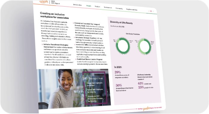 leaving a positive legacy for our world Creating an inclusive workplace for associates An inclusive, bias-free and equitable workplace enables all associates to be celebrated for who they are and to reach their full potential. In 2021, we transformed associate experiences through behavioral inclusion in our recruiting, training and education efforts. Those efforts tangibly came to life in ways such as: o Inclusive Recruitment Strategies: Standardized the number of interviewers and interview questions asked in screenings to create a consistent experience for all candidates; ensured at least two diverse individuals are considered for corporate roles where gender or ethnicity are underrepresented in director and above roles. o Created and Launched Our Inaugural Diversity Week: Dedicated time to celebrate intersectionality and types of diversity that aren’t formally recognized at other parts of the year, such as intergenerational diversity and disability awareness. o Introduced Stronger Together : A 21-day challenge for associates to build personal habits through everyday inclusive actions. o Invested $2 Million in Inclusion in Action: Mandatory quarterly in-store training for all store and salon associates and leaders on topics including unconscious bias, creating equitable shopping experiences and building trust and empathy. o Established Diverse Leaders Program: Leadership-led program to empower, inspire and educate high-potential diverse associates. DEI Recognition Forbes’ Best Employers for Women Forbes’ Best Employers for Diversity DiversityInc 2021 Noteworthy Company for Diversity Diversity at Ulta Beauty As of January 29, 2022 Ulta Beauty Associates In 2021: 39% diverse hires across all corporate associates Ulta Beauty leadership (director level and above) consists of 65% women and 25% people of color 50% diverse hires at the director level and above 2021 ESG Report 15 People Introduction Environment Product Supplemental Data Community