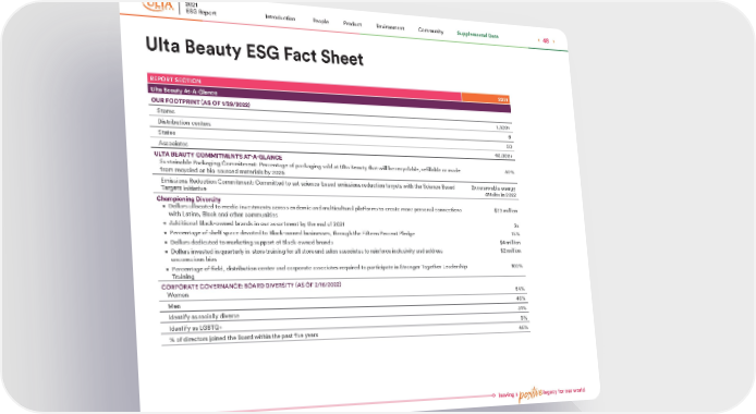 leaving a positive legacy for our world Ulta Beauty ESG Fact Sheet REPORT SECTION 2021 Ulta Beauty At-A-Glance OUR FOOTPRINT (AS OF 1/29/2022) Stores 1,300+ Distribution centers 6 States 50 Associates 40,000+ ULTA BEAUTY COMMITMENTS AT-A-GLANCE Sustainable Packaging Commitment: Percentage of packaging sold at Ulta Beauty that will be recyclable, refillable or made from recycled or bio-sourced materials by 2025 50% Emissions Reduction Commitment: Committed to set science-based emissions reduction targets with the Science Based Targets initiative 2x renewable energy credits in 2022 Championing Diversity • Dollars allocated to media investments across endemic and multicultural platforms to create more personal connections with Latine, Black and other communities $20 million • Additional Black-owned brands in our assortment by the end of 2021 2x • Percentage of shelf space devoted to Black-owned businesses, through the Fifteen Percent Pledge 15% • Dollars dedicated to marketing support of Black-owned brands $4 million • Dollars invested in quarterly in-store training for all store and salon associates to reinforce inclusivity and address unconscious bias $2 million • Percentage of field, distribution center and corporate associates required to participate in Stronger Together Leadership Training 100% CORPORATE GOVERNANCE: BOARD DIVERSITY (AS OF 2/16/2022) Women 54% Men 46% Identify as racially diverse 31% Identify as LGBTQ+ 8% % of directors joined the Board within the past five years 46% 2021 ESG Report 48 Supplemental Data Community Environment Product People Introduction