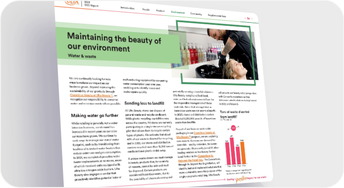 leaving a positive legacy for our world We are continually looking for new ways to reduce our impact as our business grows. Beyond improving the sustainability of our products through Conscious Beauty at Ulta Beauty™ , we recognize our responsibility to conserve water and minimize waste where possible. Making water go further While retailing is generally not a water- intensive business, our demand has increased in recent years as our salon services have grown. We continue to seek ways to manage our stores’ water footprint, such as by transitioning from traditional to instant water heaters that reduce water use and gas consumption. In 2021, we completed proactive water heater replacements at 48 stores, seven of which received units equipped with ultra-low nitrogen oxide burners. Ulta Beauty also engages a vendor that proactively identifies potential leaks or malfunctioning equipment by comparing water consumption year over year, enabling us to identify issues and make repairs quickly. Sending less to landfill All Ulta Beauty stores can dispose of general waste and recycle cardboard. While plastic recycling capabilities vary across the country, 110 stores are currently participating in a single-stream recycling pilot that allows them to recycle certain types of plastic. We estimate that about 48% of our waste is diverted for recycling, and in 2020, our stores and distribution centers recycled more than 12,348 tons of cardboard and plastic shrink wrap. A unique waste stream we must manage is beauty products that, for a variety of reasons, cannot be sold and must be disposed. Certain products are considered hazardous waste, due to the possibility of chemicals mixing and will provide our beauty retail perspective with Consortium partners as they determine which solutions to implement in 2022 and beyond. potentially creating a harmful substance. Ulta Beauty complies with all local, state and federal environmental laws for the responsible management of these materials. Items that are regulated as hazardous waste are not sent to a landfill. In 2020, stores and distribution centers diverted 2,292,946 pounds of hazardous waste from landfills. As part of our focus on sustainable packaging in our Conscious Beauty at Ulta Beauty™ program, we are exploring new ways to decrease our demand for materials—and by extension, the waste we generate. We recently joined 13 other leading retailers as the Beauty Sector Lead Partner in the Consortium to Reinvent the Retail Bag . The Consortium, through its Beyond the Bag Initiative, will identify, test and implement solutions that more sustainably serve the purpose of the single-use plastic retail bag. Ulta Beauty Maintaining the beauty of our environment Water & waste 1 Waste management reporting and distribution center self-reporting. Tons of waste diverted from landfill 1 (In Thousands) 2021 ESG Report 34 Environment Product People Introduction Supplemental Data Community
