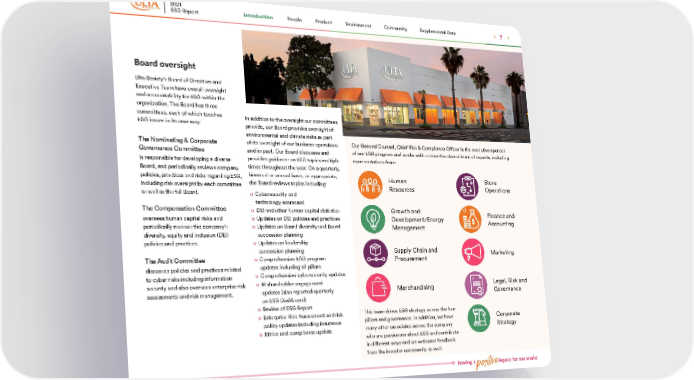 leaving a positive legacy for our world Our General Counsel, Chief Risk & Compliance Officer is the executive sponsor of our ESG program and works with a cross-functional team of experts, including representatives from: Human Resources Growth and Development/Energy Management Supply Chain and Procurement Merchandising Store Operations Finance and Accounting Marketing Legal, Risk and Governance This team drives ESG strategy across the four pillars and governance. In addition, we have many other associates across the company who are passionate about ESG and contribute in different ways and we welcome feedback from the investor community as well. Corporate Strategy Board oversight Ulta Beauty’s Board of Directors and Executive Team have overall oversight and accountability for ESG within the organization. The Board has three committees, each of which touches ESG issues in its own way: The Nominating & Corporate Governance Committee is responsible for developing a diverse Board, and periodically reviews company policies, practices and risks regarding ESG, including risk oversight by each committee as well as the full Board. The Compensation Committee oversees human capital risks and periodically reviews the company’s diversity, equity and inclusion (DEI) policies and practices. The Audit Committee discusses policies and practices related to cyber risks including information security and also oversees enterprise risk assessments and risk management. In addition to the oversight our committees provide, our Board provides oversight of environmental and climate risks as part of its oversight of our business operations and impact. Our Board discusses and provides guidance on ESG topics multiple times throughout the year. On a quarterly, biannual or annual basis, as appropriate, the Board reviews topics including: o Cybersecurity and technology scorecard o DEI and other human capital statistics o Updates on DEI policies and practices o Updates on Board diversity and Board succession planning o Updates on leadership succession planning o Comprehensive ESG program updates including all pillars o Comprehensive cybersecurity updates o IR shareholder engagement updates (also reported quarterly on ESG Dashboard) o Review of ESG Report o Enterprise Risk Assessment and risk policy updates including insurance o Ethics and compliance update Environment Product People Supplemental Data Community 2021 ESG Report 7 Introduction