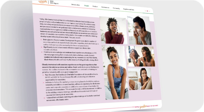leaving a positive legacy for our world Today, Ulta Beauty is proud that 25% of leadership (director level and above) are people of color, and we believe that we can improve even further. We actively assess data, recruiting and promotional processes to build the infrastructure, platforms and processes needed to set goals and hold ourselves accountable to increasing representation in management. In 2022 and beyond, we will keep a focus on inclusive leadership as well as behavioral and structural inclusion as we nurture our culture and ensure all associates can reach their full potential. We remain committed to retaining, developing and attracting diverse talent. This year, we will: o Reimagine the Diverse Leaders Development Program to double the number of associates and include expanded external partner expertise, dedicated trainings as well as CEO and executive mentorship for future company leaders o Significantly invest in incremental efforts to support our diverse slate recruitment efforts o Continue to acknowledge and celebrate lived experiences with always-on DEI internal programming that includes dedicated workshops, panels, keynote speakers and educational programming for key moments such as Pride Month, Black History Month and Asian Pacific American Heritage Month, among others Closely intertwined with associate experiences are the guest experiences that come to life daily in our stores and online. Guest-centricity is core to Ulta Beauty’s success. We continue to invest in the communities we serve and our trainings to prioritize inclusivity with every guest engagement. o New this year, the Ulta Beauty Charitable Foundation will donate $2 million to BIPOC and LGBTQ+-focused nonprofits with volunteering and education opportunities for associates. o Inclusion in Action, the quarterly, in-store training launched in 2021 to reinforce inclusivity and address unconscious bias, will now be mandatory for distribution center and corporate associates in addition to a second year of curriculum for salon and store associates. This accounts for a $2.5 million investment, in addition to the existing company trainings, and will result in a minimum 3.5 hours of required DEI training for all associates. o Textured hair and shade-matching education trainings will be further enriched across every Ulta Beauty salon. 2021 ESG Report 16 People Introduction Environment Product Supplemental Data Community