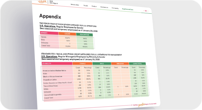 leaving a positive legacy for our world Appendix GENDER COUNT PERCENTAGE Female 33,973 94.1% Male 2,120 5.9% Unknown 1 0.0% Grand Total 36,094 100.0% ETHNICITY FEMALE MALE UNKNOWN GRAND TOTAL Count Percentage Count Percentage Count Percentage Count Percentage American Indian/Alaskan Native 50 0.8% 3 0.6% 53 0.8% Asian 120 1.9% 16 3.3% 136 2.0% Black or African American 492 8.0% 44 9.1% 536 8.1% Hispanic or Latino 1,420 23.0% 138 28.6% 1,558 23.4% Native Hawaiian or Other Pacific Island 20 0.3% 2 0.4% 22 0.3% Two or More Races 212 3.4% 17 3.5% 229 3.4% White 3,791 61.4% 258 53.5% 1 0.0% 4,050 60.9% Unknown 51 0.8% 4 0.8% 55 0.8% I do not wish to provide 16 0.3% 0 0.0% 16 0.2% Grand Total 6,1 7 2 92.7% 482 7.2% 1 0.0% 6,655 100.0% THE PERCENTAGE OF EACH GENDER CATEGORY FOR U.S. OPERATIONS U.S. Operations , Regular Employees by Gender (less seasonal and temporary employees) as of January 29, 2022 STANDARD EEO-1 RACIAL AND ETHNIC GROUP CATEGORIES FOR U.S. OPERATIONS FOR MANAGEMENT U.S. Operations , Regular Managerial Employees by Ethnicity & Gender (less seasonal and temporary employees) as of January 29, 2022 2021 ESG Report 46 Supplemental Data Community Environment Product People Introduction