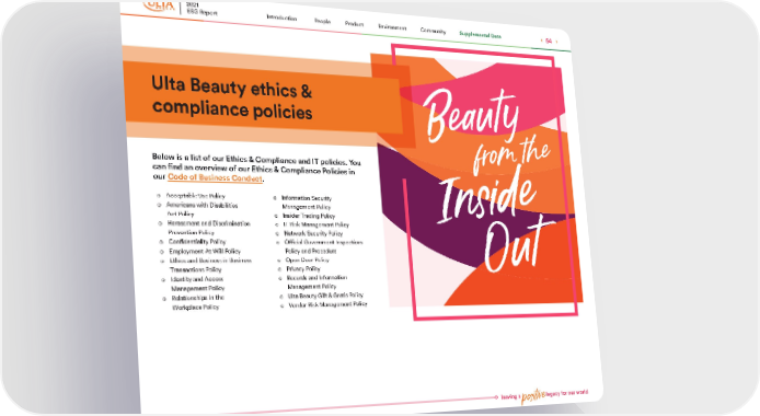 leaving a positive legacy for our world o Information Security Management Policy o Insider Trading Policy o IT Risk Management Policy o Network Security Policy o Official Government Inspections Policy and Procedure o Open Door Policy o Privacy Policy o Records and Information Management Policy o Ulta Beauty Gift & Gratis Policy o Vendor Risk Management Policy o Acceptable Use Policy o Americans with Disabilities Act Policy o Harassment and Discrimination Prevention Policy o Confidentiality Policy o Employment-At-Will Policy o Ethics and Business in Business Transactions Policy o Identity and Access Management Policy o Relationships in the Workplace Policy Ulta Beauty ethics & compliance policies Below is a list of our Ethics & Compliance and IT policies. You can find an overview of our Ethics & Compliance Policies in our Code of Business Conduct . 2021 ESG Report 54 Supplemental Data Community Environment Product People Introduction