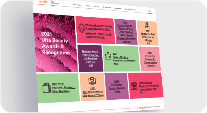 leaving a positive legacy for our world Newsweek America’s Most Trusted Brands for 2022 Winner of “Most Trusted Cosmetics Brand” 2021 Beacon Awards— Winner of “Best Large Retailers” in the “Game- Changing Retailers” category 2021 Forbes The Best Employers for Women #15 National Retail Federation Top 100 Retailers 2021 List #64 2021 DiversityInc Noteworthy Companies for Diversity 2021 CIO 100 Awards— Ulta Beauty IT Team 2021 Most Improved Retailer— Mind the Store 2021 Bloomberg Gender-Equality Index Fast Company Most Innovative Retail Companies of 2021 #6 2021 Forbes The Best Employers for Diversity #108 2021 Ulta Beauty Awards & Recognition 2021 ESG Report 52 Supplemental Data Community Environment Product People Introduction
