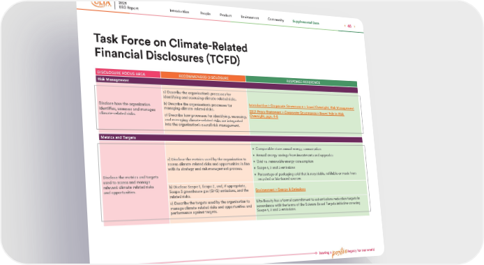 leaving a positive legacy for our world Task Force on Climate-Related Financial Disclosures (TCFD) DISCLOSURE FOCUS AREA RECOMMENDED DISCLOSURE RESPONSE/REFERENCE Risk Management Disclose how the organization identifies, assesses and manages climate-related risks. a) Describe the organization’s processes for identifying and assessing climate-related risks. b) Describe the organization’s processes for managing climate-related risks. c) Describe how processes for identifying, assessing, and managing climate-related risks are integrated into the organization’s overall risk management. Introduction > Corporate Governance > Board Oversight, Risk Management 2021 Proxy Statement > Corporate Governance > Board Role in Risk Oversight, pgs. 4-5 Metrics and Targets Disclose the metrics and targets used to assess and manage relevant climate-related risks and opportunities. a) Disclose the metrics used by the organization to assess climate-related risks and opportunities in line with its strategy and risk management process. • Comparable store annual energy consumption • Annual energy savings from investments and upgrades • Grid vs. renewable energy consumption • Scope 1, 2 and 3 emissions • Percentage of packaging sold that is recyclable, refillable or made from recycled or bio-based sources b) Disclose Scope 1, Scope 2, and, if appropriate, Scope 3 greenhouse gas (GHG) emissions, and the related risks. Environment > Energy & Emissions c) Describe the targets used by the organization to manage climate-related risks and opportunities and performance against targets. Ulta Beauty has a formal commitment to set emissions reduction targets in accordance with the terms of the Science Based Targets initiative covering Scope 1, 2 and 3 emissions. 2021 ESG Report 45 Supplemental Data Community Environment Product People Introduction