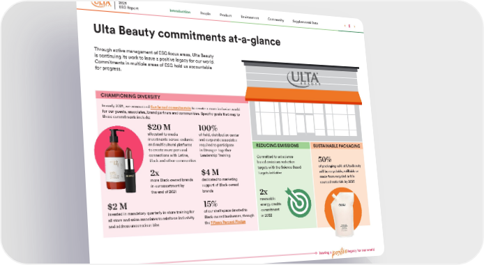 leaving a positive legacy for our world In early 2021, we announced five broad commitments to create a more inclusive world for our guests, associates, brand partners and communities. Specific goals that map to these commitments include: CHAMPIONING DIVERSITY 2x more Black-owned brands in our assortment by the end of 2021 $4 M dedicated to marketing support of Black-owned brands 15% of our shelf space devoted to Black-owned businesses, through the Fifteen Percent Pledge $2 M invested in mandatory quarterly in-store training for all store and salon associates to reinforce inclusivity and address unconscious bias $20 M allocated to media investments across endemic and multicultural platforms to create more personal connections with Latine, Black and other communities 100% of field, distribution center and corporate associates required to participate in Stronger Together Leadership Training SUSTAINABLE PACKAGING 50% of packaging sold at Ulta Beauty will be recyclable, refillable or made from recycled or bio- sourced materials by 2025 Through active management of ESG focus areas, Ulta Beauty is continuing its work to leave a positive legacy for our world. Commitments in multiple areas of ESG hold us accountable for progress. Ulta Beauty commitments at-a-glance REDUCING EMISSIONS Committed to set science- based emissions reduction targets with the Science Based Targets initiative 2x renewable energy credits commitment in 2022 Environment Product People Supplemental Data Community 2021 ESG Report 5 Introduction