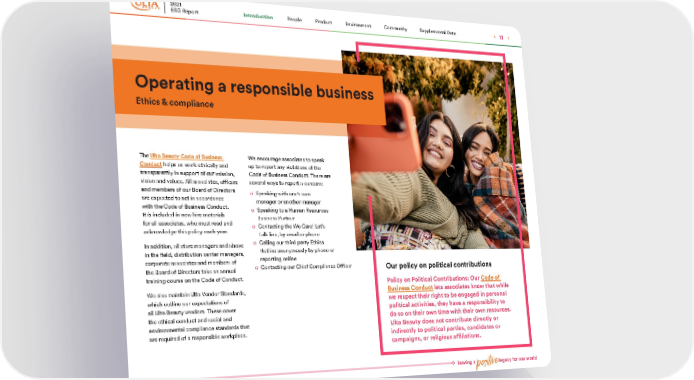 leaving a positive legacy for our world Operating a responsible business Ethics & compliance The Ulta Beauty Code of Business Conduct helps us work ethically and transparently in support of our mission, vision and values. All associates, officers and members of our Board of Directors are expected to act in accordance with the Code of Business Conduct. It is included in new hire materials for all associates, who must read and acknowledge this policy each year. In addition, all store managers and above in the field, distribution center managers, corporate associates and members of the Board of Directors take an annual training course on the Code of Conduct. We also maintain Ulta Vendor Standards, which outline our expectations of all Ulta Beauty vendors. These cover the ethical conduct and social and environmental compliance standards that are required of a responsible workplace. We encourage associates to speak up to report any violations of the Code of Business Conduct. There are several ways to report a concern: o Speaking with one’s own manager or another manager o Speaking to a Human Resources Business Partner o Contacting the We Care! Let’s Talk line, by email or phone o Calling our third-party Ethics Hotline anonymously by phone or reporting online o Contacting our Chief Compliance Officer Our policy on political contributions Policy on Political Contributions: Our Code of Business Conduct lets associates know that while we respect their right to be engaged in personal political activities, they have a responsibility to do so on their own time with their own resources. Ulta Beauty does not contribute directly or indirectly to political parties, candidates or campaigns, or religious affiliations. Environment Product People Supplemental Data Community 2021 ESG Report 11 Introduction