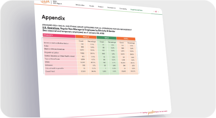 leaving a positive legacy for our world ETHNICITY FEMALE MALE TOTAL Count Percentage Count Percentage Count Percentage American Indian/Alaskan Native 242 0.9% 20 0.1% 262 0.9% Asian 935 3.4% 55 0.2% 990 3.4% Black or African American 3,065 11.0% 153 0.6% 3,218 10.9% Hispanic or Latino 7, 9 8 3 28.7% 540 1.9% 8,523 29.0% Native Hawaiian or Other Pacific Island 105 0.4% 16 0.1% 121 0.4% Two or More Races 1,239 4.5% 80 0.3% 1,319 4.5% White 13,861 49.9% 748 2.7% 14,609 49.6% Unknown 316 1.1% 25 0.1% 341 1.2% I do not wish to provide 55 0.2% 1 0.0% 56 0.2% Grand Total 2 7, 8 0 1 94.4% 1,638 5.6% 29,439 100.0% STANDARD EEO-1 RACIAL AND ETHNIC GROUP CATEGORIES FOR U.S. OPERATIONS FOR NON-MANAGEMENT U.S. Operations , Regular Non-Managerial Employees by Ethnicity & Gender (less seasonal and temporary employees) as of January 29, 2022 Appendix 2021 ESG Report 47 Supplemental Data Community Environment Product People Introduction