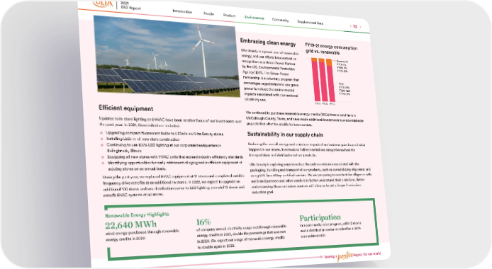 leaving a positive legacy for our world Efficient equipment Updates to in-store lighting and HVAC have been another focus of our investments over the past year. In 2021, these initiatives included: o Upgrading compact fluorescent bulbs to LEDs in 100 Ulta Beauty stores o Installing LEDs in all new store construction o Continuing to use 100% LED lighting at our corporate headquarters in Bolingbrook, Illinois o Equipping all new stores with HVAC units that exceed industry efficiency standards o Identifying opportunities for early retirement of aging and inefficient equipment at existing stores on an annual basis. During the past year, we replaced HVAC equipment at 17 stores and completed variable frequency drive retrofits at an additional 16 stores. In 2022, we expect to upgrade an additional 100 stores and one distribution center to LED lighting, remodel 12 stores and retrofit HVAC systems at 50 stores. Embracing clean energy Ulta Beauty is a proud user of renewable energy, and our efforts have earned us recognition as a Green Power Partner by the U.S. Environmental Protection Agency (EPA). The Green Power Partnership is a voluntary program that encourages organizations to use green power to reduce the environmental impacts associated with conventional electricity use. 22,640 MWh wind energy purchased through renewable energy credits in 2020 Renewable Energy Highlights 16% of company annual electricity usage met through renewable energy credits in 2021, double the percentage that was met in 2020. We expect our usage of renewable energy credits to double again in 2022. FY19-21 energy consumption grid vs. renewable We continued to purchase renewable energy credits (RECs) from a wind farm in McCullough County, Texas, and have made additional investments in residential solar projects that offer tax credits to homeowners. Sustainability in our supply chain Reducing the overall energy and emissions impact of our business goes beyond what happens in our stores. It extends to indirect emissions categories such as the transportation and distribution of our products. Ulta Beauty is exploring ways to reduce the carbon emissions associated with the packaging, handling and transport of our products, such as consolidating shipments and using EPA SmartWay-certified carriers. We are preparing to conduct due diligence with our brand partners and other vendors to better understand their emissions. Better understanding these emissions sources will allow us to set a Scope 3 emissions reduction goal. Participation in a community solar program, with 13 stores and a distribution center enrolled for a 100% renewable match 2021 ESG Report 32 Environment Product People Introduction Supplemental Data Community