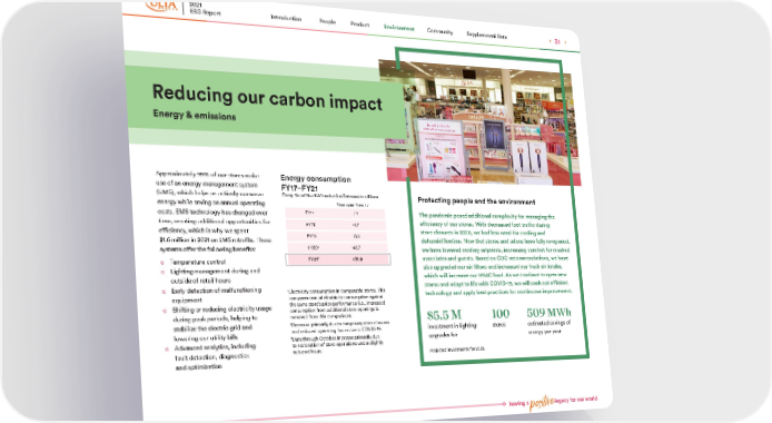 leaving a positive legacy for our world Reducing our carbon impact Energy & emissions Approximately 99% of our stores make use of an energy management system (EMS), which helps us actively conserve energy while saving on annual operating costs. EMS technology has changed over time, creating additional opportunities for efficiency, which is why we spent $1.6 million in 2021 on EMS retrofits. These systems offer the following benefits: o Temperature control o Lighting management during and outside of retail hours o Early detection of malfunctioning equipment o Shifting or reducing electricity usage during peak periods, helping to stabilize the electric grid and lowering our utility bills o Advanced analytics, including fault detection, diagnostics and optimization $5.5 M investment in lighting upgrades for 100 stores 509 MWh estimated savings of energy per year Energy consumption FY17–FY21 Comp Store 1 Net kWh reduction/increase in millions FY17 -3.1 FY18 -1.7 FY19 -0.9 FY20 2 -45.7 FY21 3 +31.9 Year-over-Year +/- Projected investments for 2022. Protecting people and the environment The pandemic posed additional complexity for managing the efficiency of our stores. With decreased foot traffic during store closures in 2020, we had less need for cooling and dehumidification. Now that stores and salons have fully re-opened, we have lowered cooling setpoints, increasing comfort for masked associates and guests. Based on CDC recommendations, we have also upgraded our air filters and increased our fresh air intake, which will increase our HVAC load. As we continue to open new stores and adapt to life with COVID-19, we will seek out efficient technology and apply best practices for continuous improvement. 1 Electricity consumption in comparable stores. This compares annual electricity consumption against the same store’s prior performance (i.e., increased consumption from additional store openings is removed from this comparison). 2 Decrease primarily due to temporary store closures and reduced operating hours due to COVID-19. 3 Data through October. Increase primarily due to restoration of store operations under slightly reduced hours. 2021 ESG Report 31 Environment Product People Introduction Supplemental Data Community