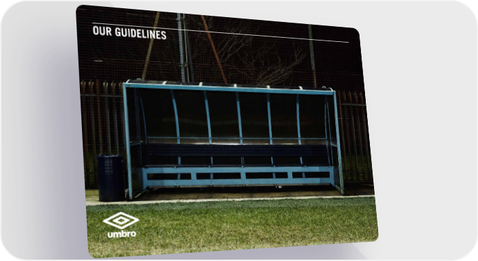 BRAND GUIDELINES 17 PERIMETER BOARDS Against the noise of a match environment it is important to maintain visual clarity for the brand. Keeping our perimeter boards uncluttered and elegant conveys confidence and good design sensibility. Here are some simple rules to use so that perimeter board graphics always present the brand in the clearest way and stand out from the noise around it. – Always place the stacked double diamond Umbro logo to the right hand side of the perimeter board. – If the perimeter board is a digital animation, keep the stacked double diamond Umbro logo visible at all times. – Always sign off digital animations with the umbro URL centrally aligned and stacked double diamond Umbro logos on both sides. – Please use the bespoke URL type provided below for maximum legibility. Please contact the Brand Marketing Team if you have any questions. Contact details can be found on page 5 of this document. URL On our communications we want to encourage visits to our .com site. There has been a specific logotype created for this purpose. Do not type the web address by hand. The white out of black URL logo should be used wherever possible. If this isnt possible please use the black URL graphic on white. For local URLs, please follow the same guidelines. — Pantone Black — CMYK 0%C 0% M 90%Y 100%K — The black umbro.com logo should only be used on white. — This is not a boxed version of the URL S2 Perimeter board example. Stacked double diamond logo on right hand side URL sign off with stacked double diamond Umbro logos on both sides URL GRAPHIC Black URL logo