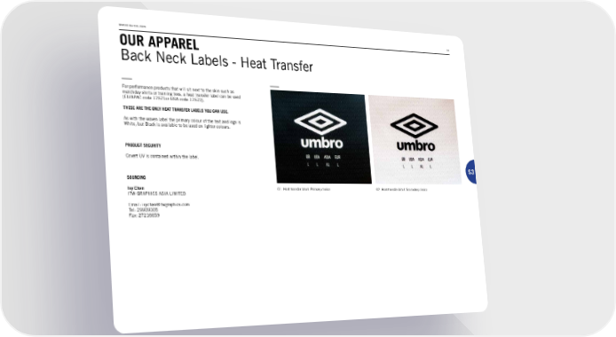 BRAND GUIDELINES 24 OUR APPAREL Back Neck Labels - Heat Transfer For performance products that will sit next to the skin such as matchday shirts or training tees, a heat transfer label can be used (EU/APAC code 17571or USA code 17572). THESE ARE THE ONLY HEAT TRANSFER LABELS YOU CAN USE. As with the woven label the primary colour of the text and logo is White, but Black is available to be used on lighter colours. PRODUCT SECURITY Covert UV is contained within the label. SOURCING Ivy Chan ITW GRAPHICS ASIA LIMITED Email: [email protected] Tel: 29909305 Fax: 27216659 S3 01. Heat transfer label. Primary choice 02. Heat transfer label. Secondary choice