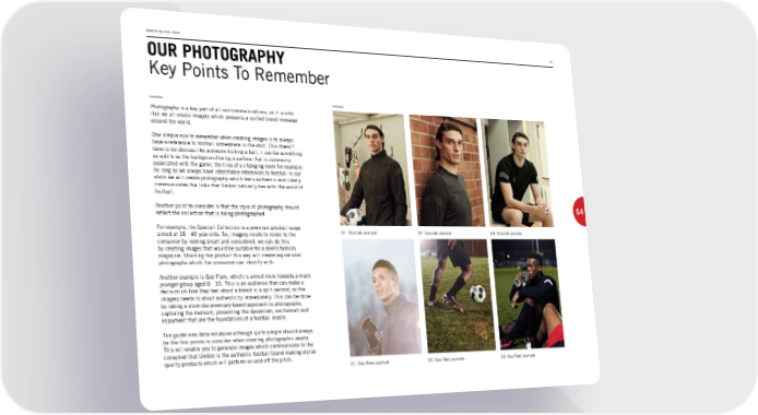 BRAND GUIDELINES 35 OUR PHOTOGRAPHY Key Points To Remember Photography is a key part of all our communications, so it is vital that we all create imagery which presents a unified brand message around the world. One simple rule to remember when creating images is to always have a reference to football somewhere in the shot. This doesn’t have to be obvious like someone kicking a ball, it can be something as subtle as the background being a surface that is commonly associated with the game, the tiles of a changing room for example. As long as we always have identifiable references to football in our shots we will create photography which feels authentic and clearly communicates the links that Umbro naturally has with the world of football. Another point to consider is that the style of photography should reflect the collection that is being photographed. For example, the Speciali Collection is a premium product range aimed at 18 - 40 year olds. So, imagery needs to relate to the consumer by looking smart and considered, we can do this by creating images that would be suitable for a men’s fashion magazine. Shooting the product this way will create aspirational photographs which the consumer can identify with. Another example is Geo Flare, which is aimed more towards a much younger group aged 8 - 15. This is an audience that can make a decision on how they feel about a brand in a split second, so the imagery needs to shout authenticity immediately. This can be done by taking a more documentary-based approach to photographs, capturing the moment, presenting the dynamism, excitement and enjoyment that are the foundations of a football match. The guidelines detailed above although quite simple should always be the first points to consider when creating photographic assets. This will enable you to generate images which communicate to the consumer that Umbro is the authentic football brand making stylish quality products which will perform on and off the pitch. S4 01. Speciali example 02. Speciali example 03. Speciali example 01. Geo Flare example 02. Geo Flare example 03. Geo Flare example