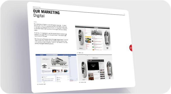 BRAND GUIDELINES 34 OUR MARKETING Digital The importance of digital in our world grows every day - it’s often the first port of call for customers and fans, and offers a great way to talk about our brand activity. As such, it’s important to maintain a consistent brand identity across all our digital and social media pages. To do this, it’s important to use the stacked double diamond logo example. as a sign off on all sites positioned in the bottom right hand corner of the page. On sites such as Facebook where the page design doesn’t allow for these conventions, please use the stacked double diamond logo in all profile pictures or avatars. Think of it as Umbro’s club crest, proudly displayed wherever possible. S4 01. Twitter page 03. Youtube page 02. Facebook page