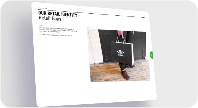 BRAND GUIDELINES 19 OUR RETAIL IDENTITY - Retail Bags The clean, sharp look of our packaging and retail signage is continued in any retail bags, with the Stacked Umbro Logo being used in white on a black background. It’s the 4-4-2 of the design world - simple but effective. S2