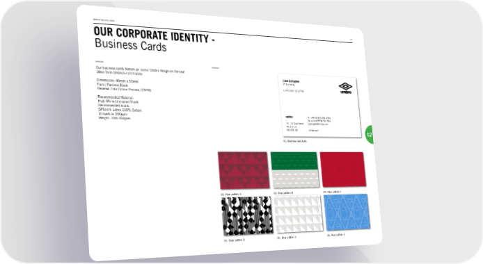 BRAND GUIDELINES 12 OUR CORPORATE IDENTITY - Business Cards Liam Gallagher VP Licensing (+44) 0161 233 2736 T: +44 (0)161 233 2736 M: +44 (0)7738 724 591 [email protected] - umbro.com umbro - 29 - 31 Dale Street Manchester M1 1EY, UK Our business cards feature an iconic Umbro design on the rear taken from Umbro’s rich history. Dimensions: 85mm x 55mm Front: Pantone Black Reverse: Four Colour Process (CMYK) Recommended Material: High White Uncoated Stock Recommended stock: GFSmith Lettra 100% Cotton Ultrawhite 300gsm Weight: 300-350gsm S2 01. Business card front 02. Rear pattern A 03. Rear pattern B 04. Rear pattern C 04. Rear pattern D 05. Rear pattern E 06. Rear pattern F