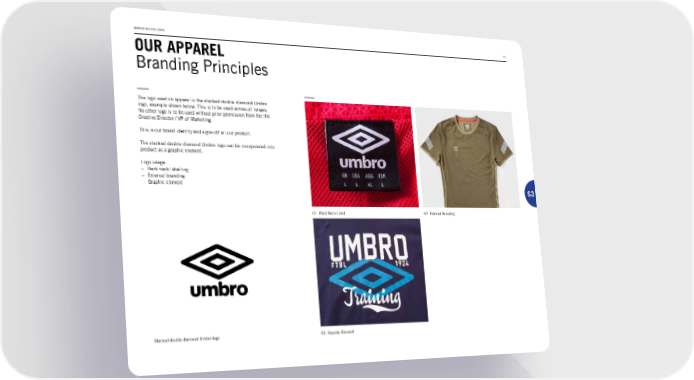 BRAND GUIDELINES 21 OUR APPAREL Branding Principles The logo used on apparel is the stacked double diamond Umbro logo, example shown below. This is to be used across all ranges. No other logo is to be used without prior permission from the the Creative Director / VP of Marketing. This is our brand identity and signs off all our product. The stacked double diamond Umbro logo can be incorporated into product as a graphic element. Logo usage: – Back neck labelling – External branding – Graphic element S3 01. Back Neck Label 03. Graphic Element Stacked double diamond Umbro logo 02. External Branding