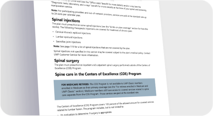 Spinal and extremity manipulations The plan covers up to 24 visits per calendar year for manipulations (adjustments) of the spine and extremities (arms and legs). See the definition of “Limited benefit.” You pay the special rate (a $15 copay) for up to 24 visits for spinal and extremity manipulations when you see a preferred provider. The copay will not apply toward your medical deductible, but the copay will apply to the out-of-pocket limit. All visits apply to the 24-visit limit. You may receive an office visit (see the “Office visits” benefit for more details) and/or x-ray (see the “Diagnostic tests, laboratory, and x-rays” benefit for more details) at the time of your spinal and extremity manipulation service. Note: For participating providers and out-of-network providers, services are paid at the standard rate up to 24 visits per calendar year. Spinal injections The plan must preauthorize some spinal injections (see the “Limits on plan coverage” section for how this works). The following therapeutic injections are covered for treatment of chronic pain: • Cervical-thoracic epidural injections • Lumbar epidural injections • Sacroiliac joint injections Note: See page 119 for a list of spinal injections that are not covered by the plan. Spinal injections not specified in this section may be covered subject to the plan’s medical policy. Contact UMP Customer Service for more information. Spinal surgery The plan must preauthorize inpatient and outpatient spinal surgery performed outside of the Centers of Excellence (COE) Program. Spine care in the Centers of Excellence (COE) Program FOR MEDICARE RETIREES: The COE Program is not available to UMP Classic members enrolled in Medicare as their primary coverage (see the “For retirees enrolled in Medicare and UMP Classic” section). Medicare members still have access to covered services related to spine care separate from the COE Program. Those services are paid at the standard rate. The Centers of Excellence (COE) Program covers 100 percent of the allowed amount for covered services related to lumbar fusion. The program includes, but is not limited to: • An evaluation to determine if surgery is appropriate. • Presurgical consultations. • Travel costs (see the “Travel benefits” section below). • Hospitalization and surgery, if surgery is determined to be appropriate. • Postsurgical check-ups. 70 2024 UMP Classic (PEBB) Certificate of Coverage