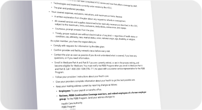 • On request, receive information from the plan about: ▪ How new technology is evaluated for inclusion as a covered service. ▪ How the plan reimburses providers. ▪ Preauthorization review requirements. ▪ Providers you select and their qualifications. ▪ Services and treatments that have completed HTCC review and how that affects coverage by UMP. ▪ Technologies and treatments currently under review by the HTCC. ▪ The plan and preferred providers. • Your covered expenses, exclusions, reductions, and maximums or limits. Receive: ▪ A written explanation from the plan about any request to refund an overpayment. ▪ All covered services and supplies determined to be medically necessary as described in this COC, subject to the maximums, limits, exclusions, deductibles, coinsurance, and copays. ▪ Courteous, prompt answers from the plan. ▪ Timely, proper medical care without discrimination of any kind — regardless of health status or condition, sex, ethnicity, race, marital status, color, national origin, age, disability, or religion. As a plan member, you have the responsibility to: • Comply with requests for information by the date given. • Confirm provider and facility network status before every visit. • Contact the plan as soon as possible if you do not understand what is covered, if you have any questions, or if you need information. • Enroll in Medicare Part A and Part B if you are currently retired, or are in the process retiring, and become eligible for Medicare. You must notify the PEBB Program when you enroll in Medicare Part A and Part B. Call 1-800-200-1004 (TRS: 711) to speak with a customer service representative for the PEBB Program. • Follow your providers’ instructions about your health care. • Give your providers complete information about your health to get the best possible care. • Keep your mailing address current by reporting changes as follows: ▪ Employees: To your payroll or benefits office. ▪ Retirees, PEBB Continuation Coverage members, and retired employees of a former employer group: To the PEBB Program. Send your address changes to: Health Care Authority PEBB Program PO Box 42684 Olympia, WA 98504 • Know how to access emergency care. • Not engage in fraud or abuse in dealing with the plan or your providers. • Participate with your providers in making decisions about your health care. • Pay your copays, coinsurance, and deductibles promptly. 146 2024 UMP Classic (PEBB) Certificate of Coverage