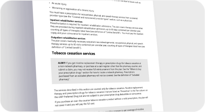 Outpatient habilitative services The plan covers medically necessary outpatient occupational, physical, and speech therapy services up to 60 visits combined per calendar year, counting all types of therapies listed here (see definition of “Limited benefit”). Rehabilitative Services The plan covers inpatient and outpatient services to improve or restore function lost due to issues such as: • An illness. • An acute injury. • Worsening or aggravation of a chronic injury. You must have a prescription for occupational, physical, and speech therapy services from a covered provider type (see the “Covered and noncovered provider types” section, such as a physician. Inpatient rehabilitation services Preauthorization is required for inpatient rehabilitation admissions. The plan covers therapy services when they are provided during inpatient rehabilitation admission, up to 60 days combined per calendar year, counting all types of therapies listed here (see definition of “Limited benefit”). You must pay the inpatient copay and your coinsurance for inpatient services. Outpatient rehabilitation services The plan covers medically necessary outpatient neurodevelopmental, occupational, physical, and speech therapy services up to 60 visits combined per calendar year, counting all types of therapies listed here (see definition of “Limited benefit”). Tobacco cessation services ALERT! If you get nicotine replacement therapy or prescription drugs for tobacco cessation at a non-network pharmacy, or purchase at a cash register other than the pharmacy counter, and submit a claim, you may not receive full reimbursement from the plan. See the “Where to buy your prescription drugs” section for how to locate a network pharmacy. Prescriptions purchased from an excluded pharmacy will not be covered. See the definition of “Excluded pharmacy”. The services described in this section are covered only for tobacco cessation. Nicotine replacement therapy and prescription drugs for tobacco cessation that are listed as “Preventive” in the Tier column on the UMP Preferred Drug List are not subject to your prescription drug deductible or coinsurance. If you purchase an over-the-counter tobacco cessation product without a valid prescription, the plan will not cover it and you will pay the full cost. TIP: You do not have to enroll in the tobacco cessation program to get coverage of nicotine replacement therapy or prescription drugs for tobacco cessation. See below for limits and rules on accessing these services. 2024 UMP Classic (PEBB) Certificate of Coverage 75