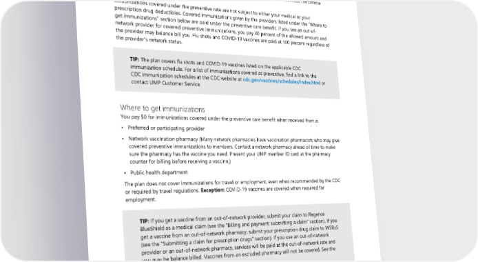 The plan covers immunizations listed on the Centers for Disease Control and Prevention (CDC) applicable immunization schedule (children, adolescents, adults) for U.S. residents. For a list of immunizations covered as preventive, visit the CDC website at cdc.gov/vaccines/schedules/index.html or contact UMP Customer Service. Some covered immunizations are classified as “may be recommended” by the CDC depending on medical condition or lifestyle. For those immunizations to be covered as preventive, you must meet the criteria specified on the CDC schedule. Immunizations covered under the preventive rate are not subject to either your medical or your prescription drug deductibles. Covered immunizations given by the providers listed under the “Where to get immunizations” section below are paid under the preventive care benefit. If you see an out-of- network provider for covered preventive immunizations, you pay 40 percent of the allowed amount and the provider may balance bill you. Flu shots and COVID-19 vaccines are paid at 100 percent regardless of the provider’s network status. TIP: The plan covers flu shots and COVID-19 vaccines listed on the applicable CDC immunization schedule. For a list of immunizations covered as preventive, find a link to the CDC immunization schedules at the CDC website at cdc.gov/vaccines/schedules/index.html or contact UMP Customer Service. Where to get immunizations You pay $0 for immunizations covered under the preventive care benefit when received from a: • Preferred or participating provider • Network vaccination pharmacy (Many network pharmacies have vaccination pharmacists who may give covered preventive immunizations to members. Contact a network pharmacy ahead of time to make sure the pharmacy has the vaccine you need. Present your UMP member ID card at the pharmacy counter for billing before receiving a vaccine.) • Public health department The plan does not cover immunizations for travel or employment, even when recommended by the CDC or required by travel regulations. Exception: COVID-19 vaccines are covered when required for employment. TIP: If you get a vaccine from an out-of-network provider, submit your claim to Regence BlueShield as a medical claim (see the “Billing and payment: submitting a claim” section). If you get a vaccine from an out-of-network pharmacy, submit your prescription drug claim to WSRxS (see the "Submitting a claim for prescription drugs" section). If you use an out-of-network provider or an out-of-network pharmacy, services will be paid at the out-of-network rate and you may be balance billed. Vaccines from an excluded pharmacy will not be covered. See the definition of “Excluded pharmacy.” Radiology Preauthorization is required for all non-emergency diagnostic imaging. Providers should obtain preauthorization before scheduling or performing any elective outpatient imaging service. Examples of imaging tests that require a preauthorization are: 2024 UMP Classic (PEBB) Certificate of Coverage 67