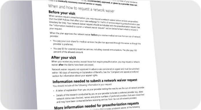 When you do not have access to a preferred provider: network waiver An approved network waiver allows the plan to pay for covered services provided by an out-of-network provider at the network rate. You may request a network waiver only when you do not have access to a preferred provider able to provide covered medically necessary services within 30 miles of your residence. A service or supply prescribed, ordered, recommended, approved, or given by a provider does not make it a medically necessary covered service or supply. When and how to request a network waiver Before your visit When services require preauthorization, you may request a network waiver before services are provided. Visit the UMP Policies that affect your care webpage for the list of services requiring preauthorization (see Directory for link). Your network waiver request should be included with the preauthorization request. See the “Information needed to submit a network waiver request” section below to learn what to include in your request. When the plan approves the network waiver before you receive medical services from an out-of-network provider: • You pay your cost-share for medical services the plan has approved through this waiver as though the provider is preferred. • You pay $0 for covered preventive services, including covered immunizations. The plan pays 100 percent of the allowed amount. After your visit When you receive any service, except those that require preauthorization, you may request a network waiver after the claims have been processed. Network waiver requests not approved in advance are considered an appeal and must be submitted within 180 days of receiving an Explanation of Benefits. See the “Complaint and appeal procedures” section for information about your appeal rights. Information needed to submit a network waiver request You should include all the following information in your request: • A letter of explanation from you or your provider stating the need to see the out-of-network provider. • Details of the research conducted by you or your provider to locate a preferred provider (e.g., dates network status was checked, names and phone numbers of preferred providers that were researched and may have been contacted before receiving services from the out-of-network provider). More information needed for preauthorization requests When submitting a request for preauthorization that includes a network waiver, all the following additional information should also be included: • Performing provider’s name, address, phone • Procedure codes number, and National Provider Identifier (NPI) • Length of treatment requested or required for or Tax ID number (TIN) services • Diagnosis codes • Estimated charges 2024 UMP Classic (PEBB) Certificate of Coverage 19