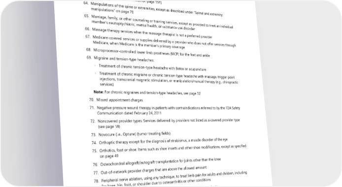 61. Lumbar radiculopathy/sciatica surgery: Minimally invasive procedures that do not include laminectomy, laminotomy, or foraminotomy, including, but not limited to, energy ablation techniques, Automated Percutaneous Lumbar Discectomy (APLD), percutaneous laser, nucleoplasty, etc. 62. Magnetic resonance imaging, (upright) (uMRI), also known as “positional,” “weight-bearing” (partial or full), or “axial loading” 63. Maintenance care (see definition on page 191) 64. Manipulations of the spine or extremities, except as described under “Spinal and extremity manipulations” on page 70 65. Marriage, family, or other counseling or training services, except as provided to treat an individual member’s neuropsychiatric, mental health, or substance use disorder 66. Massage therapy services when the massage therapist is not a preferred provider 67. Medicare-covered services or supplies delivered by a provider who does not offer services through Medicare, when Medicare is the member’s primary coverage 68. Microprocessor-controlled lower limb prostheses (MCP) for the feet and ankle 69. Migraine and tension-type headaches: ◦ Treatment of chronic tension-type headache with Botox or acupuncture ◦ Treatment of chronic migraine or chronic tension-type headache with massage, trigger point injections, transcranial magnetic stimulation, or manipulation/manual therapy (e.g., chiropractic services) Note: For chronic migraines and tension-type headaches, see page 52 70. Missed appointment charges 71. Negative pressure wound therapy in patients with contraindications referred to by the FDA Safety Communication dated February 24, 2011 72. Noncovered provider types: Services delivered by providers not listed as a covered provider type (see page 18) 73. Novocure (i.e., Optune) (tumor treating fields) 74. Orthoptic therapy except for the diagnosis of strabismus, a muscle disorder of the eye 75. Orthotics, foot or shoe: Items such as shoe inserts and other shoe modifications, except as specified on page 49 76. Osteochondral allograft/autograft transplantation for joints other than the knee 77. Out-of-network provider charges that are above the allowed amount 78. Peripheral nerve ablation, using any technique, to treat limb pain for adults and children, including for knee, hip, foot, or shoulder due to osteoarthritis or other conditions 79. Pharmacogenetic testing for patients being treated with oral anticoagulants 80. Pharmacogenomics testing for depression, mood disorders, psychosis, anxiety, attention deficit hyperactivity disorder (ADHD), and substance use disorder 81. Positron Emission Tomography (PET) scans for routine surveillance of lymphoma 82. Prescription drug charges over the allowed amount, regardless of where purchased 83. Prescription drugs that require preauthorization, unless the request is: 116 2024 UMP Classic (PEBB) Certificate of Coverage
