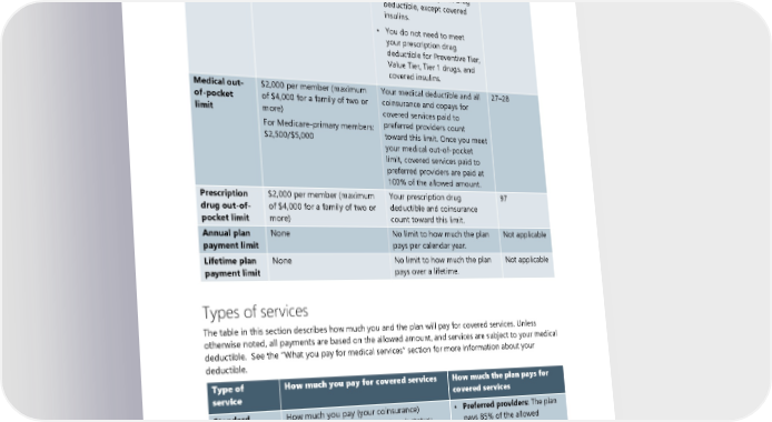 Deductibles Dollar amounts What else you need to know For more and limits information, see page(s) Prescription $100 per member (maximum of • You pay the costs for Tier 2 94–95 drug $300 for a family of three or prescription drugs until you deductible more) meet your prescription drug deductible, except covered insulins. • You do not need to meet your prescription drug deductible for Preventive Tier, Value Tier, Tier 1 drugs, and covered insulins. Medical out- $2,000 per member (maximum Your medical deductible and all 27–28 of-pocket of $4,000 for a family of two or coinsurance and copays for limit more) covered services paid to For Medicare-primary members: preferred providers count $2,500/$5,000 toward this limit. Once you meet your medical out-of-pocket limit, covered services paid to preferred providers are paid at 100% of the allowed amount. Prescription $2,000 per member (maximum Your prescription drug 97 drug out-of- of $4,000 for a family of two or deductible and coinsurance pocket limit more) count toward this limit. Annual plan None No limit to how much the plan Not applicable payment limit pays per calendar year. Lifetime plan None No limit to how much the plan Not applicable payment limit pays over a lifetime. Types of services The table in this section describes how much you and the plan will pay for covered services. Unless otherwise noted, all payments are based on the allowed amount, and services are subject to your medical deductible. See the “What you pay for medical services” section for more information about your deductible. Type of How much you pay for covered services How much the plan pays for service covered services Standard How much you pay (your coinsurance) • Preferred providers: The plan depends on the provider’s network status: pays 85% of the allowed • Preferred providers: You pay 15% of the amount. allowed amount. The provider cannot • Participating providers: The balance bill you. plan pays 60% of the allowed • Participating providers: You pay 40% of amount. the allowed amount. The provider cannot balance bill you. 2024 UMP Classic (PEBB) Certificate of Coverage 29