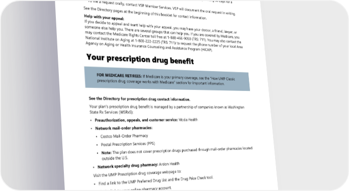 If you want to file an appeal which will be processed within 30 days, do the following: File the request in writing with VSP. See the Directory pages at the beginning of this booklet for contact information. Your appeal request will be processed within 30 days from the date your request is received. If you want to file an expedited appeal, which will be processed within 24 hours, do the following: • File an oral or written request for an expedited appeal. Specifically state that "I am requesting an expedited appeal," or "I believe that my health could be seriously harmed by waiting 30 days for a normal appeal." • To file a request orally, contact VSP Member Services. VSP will document the oral request in writing. See the Directory pages at the beginning of this booklet for contact information. Help with your appeal: If you decide to appeal and want help with your appeal, you may have your doctor, a friend, lawyer, or someone else help you. There are several groups that can help you. If you are covered by Medicare, you may contact the Medicare Rights Center toll free at 1-888-466-9050 (TRS: 711). You may also contact the National Institute on Aging at 1-800-222-2225 (TRS: 711) to request the phone number of your local Area Agency on Aging or Health Insurance Counseling and Assistance Program (HICAP). Your prescription drug benefit FOR MEDICARE RETIREES: If Medicare is your primary coverage, see the “How UMP Classic prescription drug coverage works with Medicare” section for important information. See the Directory for prescription drug contact information. Your plan’s prescription drug benefit is managed by a partnership of companies known as Washington State Rx Services (WSRxS): • Preauthorization, appeals, and customer service: Moda Health • Network mail-order pharmacies: ▪ Costco Mail-Order Pharmacy ▪ Postal Prescription Services (PPS) ▪ Note: The plan does not cover prescription drugs purchased through mail-order pharmacies located outside the U.S. • Network specialty drug pharmacy: Ardon Health Visit the UMP Prescription drug coverage webpage to: • Find a link to the UMP Preferred Drug List and the Drug Price Check tool. • Find a link to your online pharmacy account. • Find information on mail-order and specialty drugs. • Learn about submitting prescription drug claims. • Locate network pharmacies or network vaccination pharmacies. • Review prescription drug policies and programs. 2024 UMP Classic (PEBB) Certificate of Coverage 87