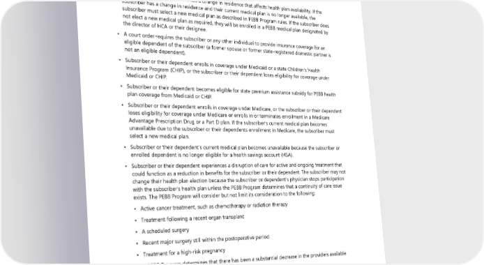 • Subscriber has a change in employment status that affects their eligibility for the employer contribution toward their employer-based group health plan. • Subscriber’s dependent has a change in their own employment status that affects their eligibility or their dependent’s eligibility for the employer contribution under their employer-based group health plan. “Employer contribution” means contributions made by the dependent’s current or former employer toward health coverage as described in the Treasury Regulation. • Subscriber or their dependent has a change in residence that affects health plan availability. If the subscriber has a change in residence and their current medical plan is no longer available, the subscriber must select a new medical plan as described in PEBB Program rules. If the subscriber does not elect a new medical plan as required, they will be enrolled in a PEBB medical plan designated by the director of HCA or their designee. • A court order requires the subscriber or any other individual to provide insurance coverage for an eligible dependent of the subscriber (a former spouse or former state-registered domestic partner is not an eligible dependent). • Subscriber or their dependent enrolls in coverage under Medicaid or a state Children’s Health Insurance Program (CHIP), or the subscriber or their dependent loses eligibility for coverage under Medicaid or CHIP. • Subscriber or their dependent becomes eligible for state premium assistance subsidy for PEBB health plan coverage from Medicaid or CHIP. • Subscriber or their dependent enrolls in coverage under Medicare, or the subscriber or their dependent loses eligibility for coverage under Medicare or enrolls in or terminates enrollment in a Medicare Advantage Prescription Drug or a Part D plan. If the subscriber’s current medical plan becomes unavailable due to the subscriber or their dependents enrollment in Medicare, the subscriber must select a new medical plan. • Subscriber or their dependent’s current medical plan becomes unavailable because the subscriber or enrolled dependent is no longer eligible for a health savings account (HSA). • Subscriber or their dependent experiences a disruption of care for active and ongoing treatment that could function as a reduction in benefits for the subscriber or their dependent. The subscriber may not change their health plan election because the subscriber or dependent’s physician stops participation with the subscriber’s health plan unless the PEBB Program determines that a continuity of care issue exists. The PEBB Program will consider but not limit its consideration to the following: ▪ Active cancer treatment, such as chemotherapy or radiation therapy ▪ Treatment following a recent organ transplant ▪ A scheduled surgery ▪ Recent major surgery still within the postoperative period ▪ Treatment for a high-risk pregnancy ▪ The PEBB Program determines that there has been a substantial decrease in the providers available under a PEBB medical plan. Note: The plan cannot guarantee that any physician, hospital, or other provider will be available or remain under contract with the plan. An enrollee may not change medical plans simply because their provider or health care facility discontinues participation with this medical plan until the PEBB Program’s next annual open enrollment or when another qualifying event creates a special open enrollment for changing health plans, unless the PEBB Program determines that a continuity of care issue exists or there has been a substantial decrease in the providers available under the plan. 2024 UMP Classic (PEBB) Certificate of Coverage 161