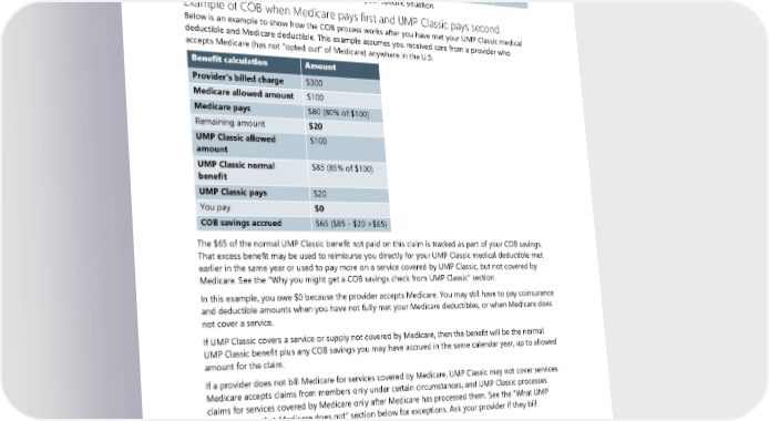 Benefit calculation Amount Since the UMP Classic benefit available (dollar amount) is greater than the balance, UMP $266.40 pays the balance remaining after Medicare pays: The difference between the normal UMP Classic benefit and the amount UMP paid is: $31.10 This amount is considered “COB savings” (see page 131). Note: This is an example only and may not apply to your specific situation. Example of COB when Medicare pays first and UMP Classic pays second Below is an example to show how the COB process works after you have met your UMP Classic medical deductible and Medicare deductible. This example assumes you received care from a provider who accepts Medicare (has not “opted out” of Medicare) anywhere in the U.S. Benefit calculation Amount Provider’s billed charge $300 Medicare allowed amount $100 Medicare pays $80 (80% of $100) Remaining amount $20 UMP Classic allowed $100 amount UMP Classic normal $85 (85% of $100) benefit UMP Classic pays $20 You pay $0 COB savings accrued $65 ($85 - $20 =$65) The $65 of the normal UMP Classic benefit not paid on this claim is tracked as part of your COB savings. That excess benefit may be used to reimburse you directly for your UMP Classic medical deductible met earlier in the same year or used to pay more on a service covered by UMP Classic, but not covered by Medicare. See the “Why you might get a COB savings check from UMP Classic” section. In this example, you owe $0 because the provider accepts Medicare. You may still have to pay coinsurance and deductible amounts when you have not fully met your Medicare deductibles, or when Medicare does not cover a service. If UMP Classic covers a service or supply not covered by Medicare, then the benefit will be the normal UMP Classic benefit plus any COB savings you may have accrued in the same calendar year, up to allowed amount for the claim. If a provider does not bill Medicare for services covered by Medicare, UMP Classic may not cover services. Medicare accepts claims from members only under certain circumstances, and UMP Classic processes claims for services covered by Medicare only after Medicare has processed them. See the “What UMP Classic covers that Medicare does not” section below for exceptions. Ask your provider if they bill Medicare. Diabetes care supplies when Medicare pays first Medicare pays claims for some diabetes care supplies under the Part B medical benefit. As a result, UMP Classic pays the claim under the DME benefit, not the prescription drug benefit. This means you will have to meet your medical deductible before UMP Classic begins to pay on diabetes care supplies claims, then 2024 UMP Classic (PEBB) Certificate of Coverage 129