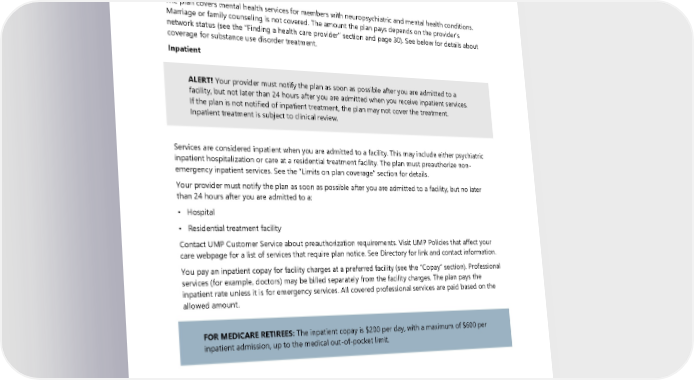 When you receive nonemergency services from an out-of-network provider at a network hospital, network hospital outpatient department, network critical access hospital, or network ambulatory surgical center, you pay the network rate and cannot be balance billed for services performed in Washington State or without your informed consent in states that allow you to waive the federal balance billing protections. When you receive emergency services you pay the network cost-sharing amount regardless of the network status of the provider or facility and cannot be balance billed. Mental health The plan covers mental health services for members with neuropsychiatric and mental health conditions. Marriage or family counseling is not covered. The amount the plan pays depends on the provider’s network status (see the “Finding a health care provider” section and page 30). See below for details about coverage for substance use disorder treatment. Inpatient ALERT! Your provider must notify the plan as soon as possible after you are admitted to a facility, but not later than 24 hours after you are admitted when you receive inpatient services. If the plan is not notified of inpatient treatment, the plan may not cover the treatment. Inpatient treatment is subject to clinical review. Services are considered inpatient when you are admitted to a facility. This may include either psychiatric inpatient hospitalization or care at a residential treatment facility. The plan must preauthorize non- emergency inpatient services. See the “Limits on plan coverage” section for details. Your provider must notify the plan as soon as possible after you are admitted to a facility, but no later than 24 hours after you are admitted to a: • Hospital • Residential treatment facility Contact UMP Customer Service about preauthorization requirements. Visit UMP Policies that affect your care webpage for a list of services that require plan notice. See Directory for link and contact information. You pay an inpatient copay for facility charges at a preferred facility (see the “Copay” section). Professional services (for example, doctors) may be billed separately from the facility charges. The plan pays the inpatient rate unless it is for emergency services. All covered professional services are paid based on the allowed amount. FOR MEDICARE RETIREES: The inpatient copay is $200 per day, with a maximum of $600 per inpatient admission, up to the medical out-of-pocket limit. Outpatient ALERT! See page 38 for preauthorization requirements related to Applied Behavior Analysis (ABA) Therapy services. 40 2024 UMP Classic (PEBB) Certificate of Coverage